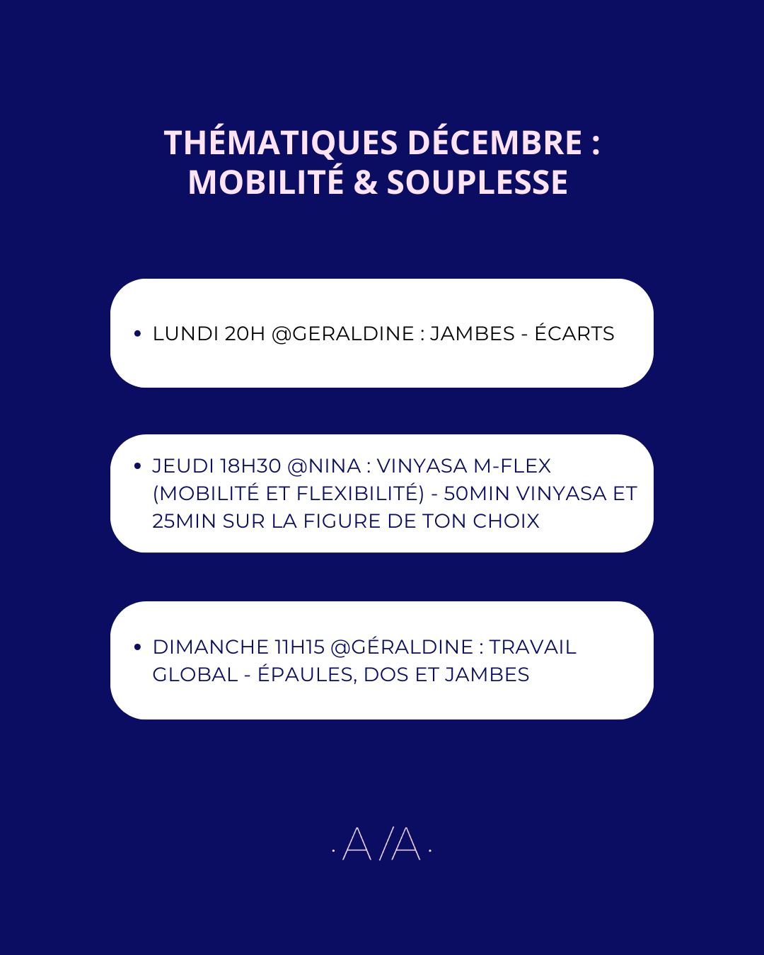 Les jeudis 18h30-19h45 avec Anna, et bientôt Vinyasa M-Flex avec Nina, avec un travail de préparation d’une posture complexe, et dimanche 11h15-12h15 avec Géraldine